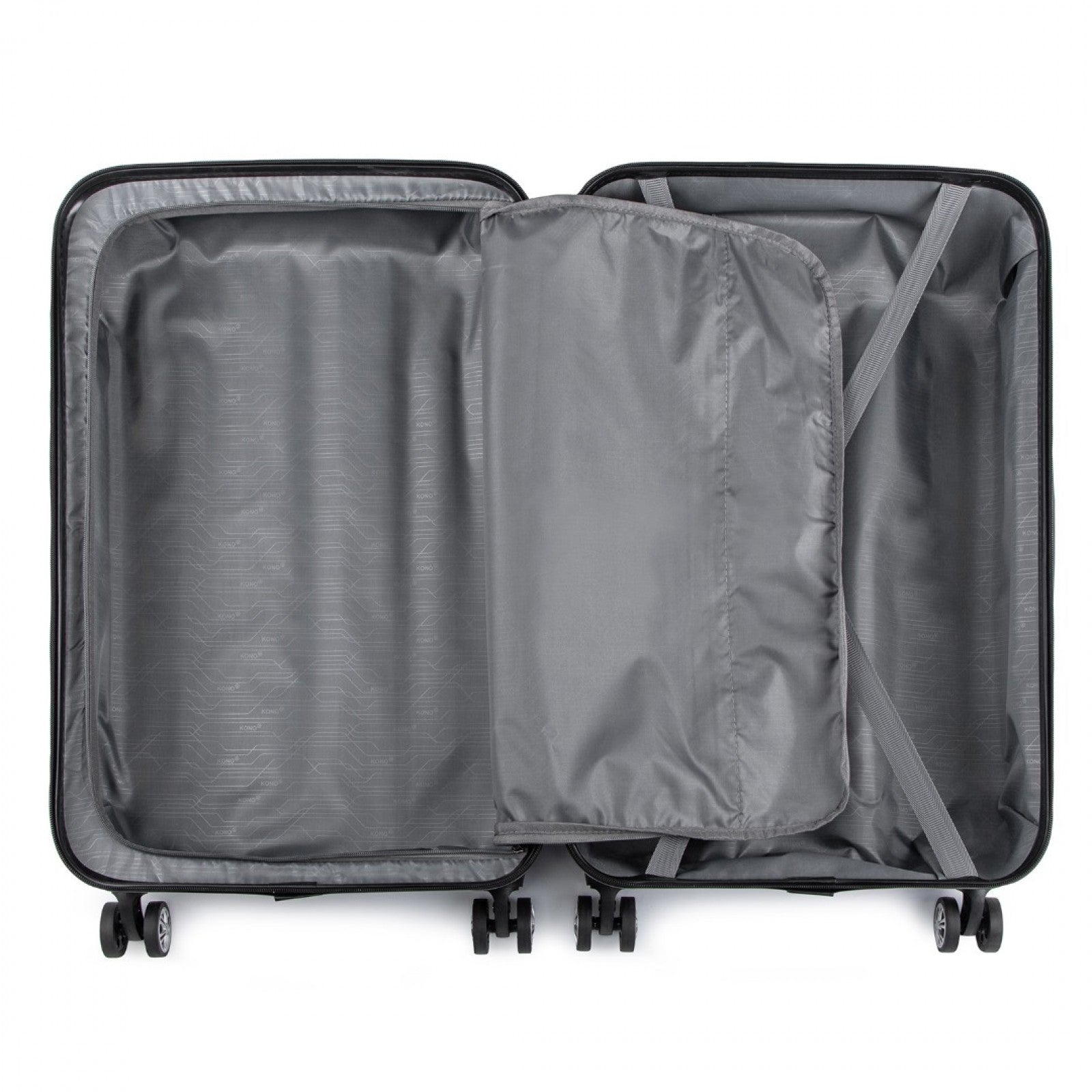 Inside, the suitcase features a smart dual-compartment layout. One side offers elastic securing straps with a buckle to hold your contents in place, while the opposite side includes a fully zippered divider and mesh pocket — perfect for separating clothing, accessories, and essentials.