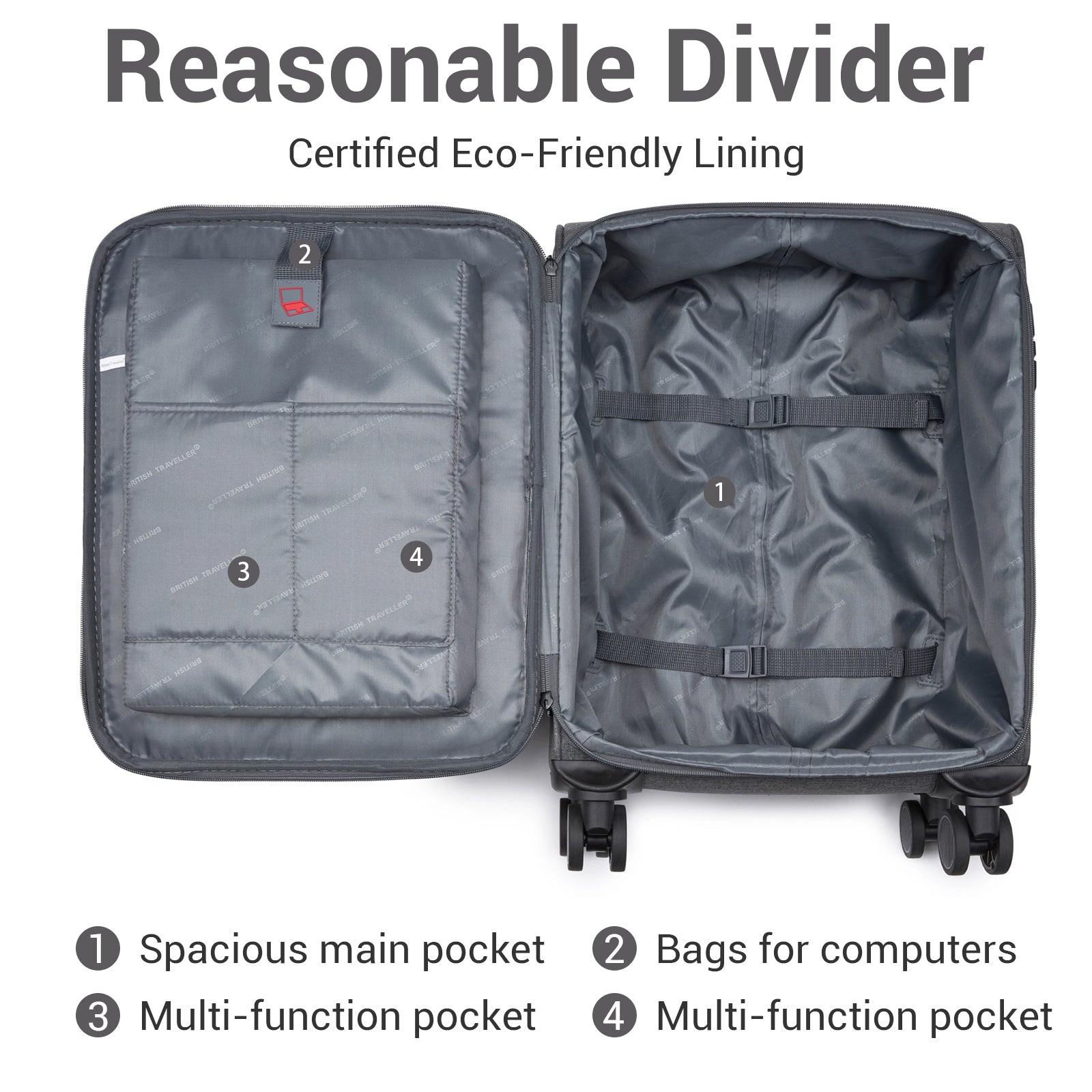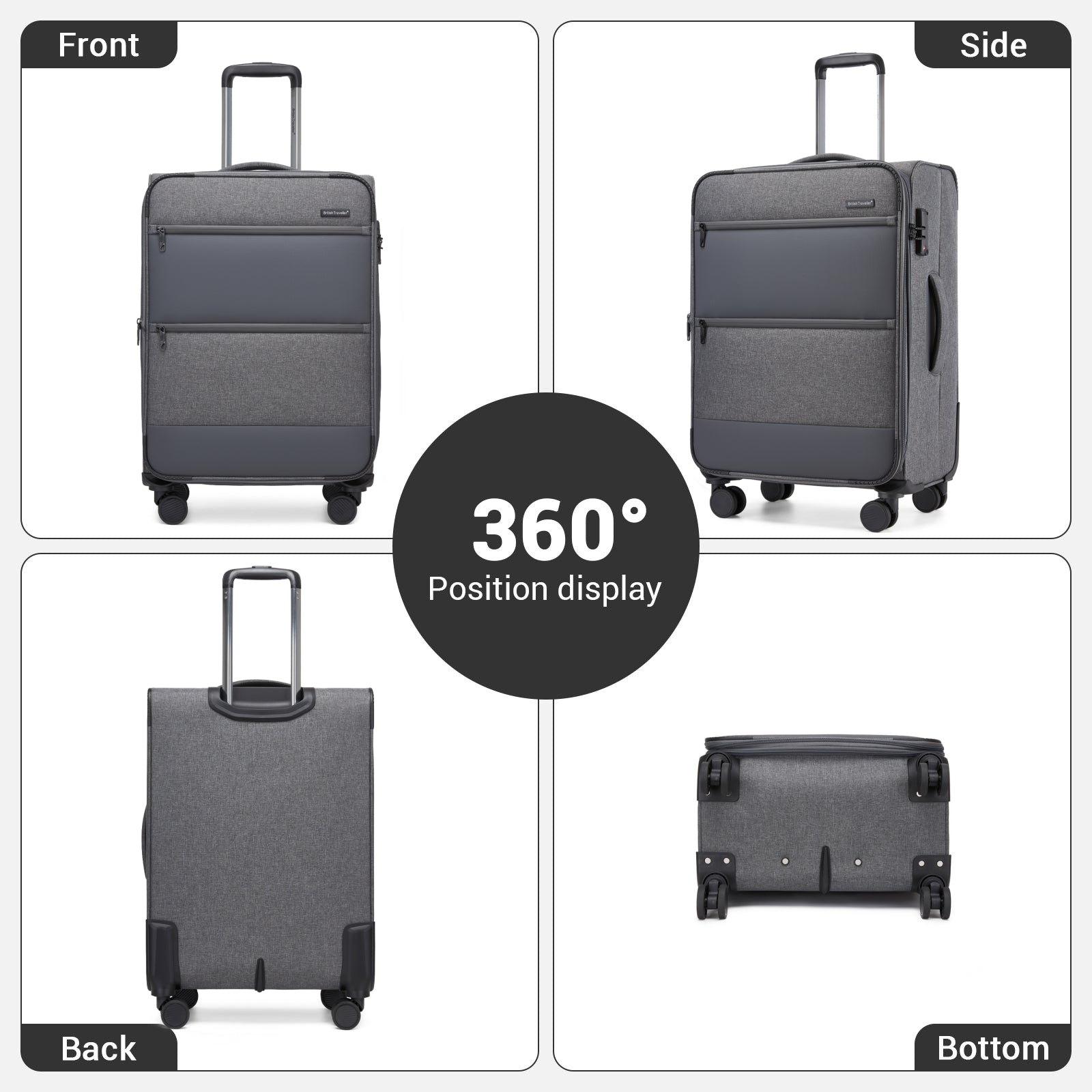 Security is handled with confidence thanks to built-in TSA-approved combination locks on all cases, paired with robust YKK zippers for reliable closure. Two water-resistant front zip pockets on each suitcase provide quick access to travel documents, chargers and everyday essentials, finished with the British Traveller logo for a clean, premium look.