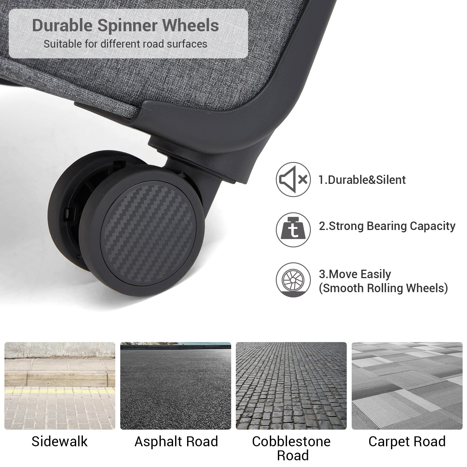All three suitcases glide effortlessly on four 360° TPE spinner wheels, delivering smooth, quiet movement across terminals, pavements and hotel floors. A sturdy iron telescopic handle with multi-stage height adjustment ensures comfortable control, while padded top and side carry handles make lifting easy. Anti-slip feet on the larger cases help keep them upright and protected when set down.